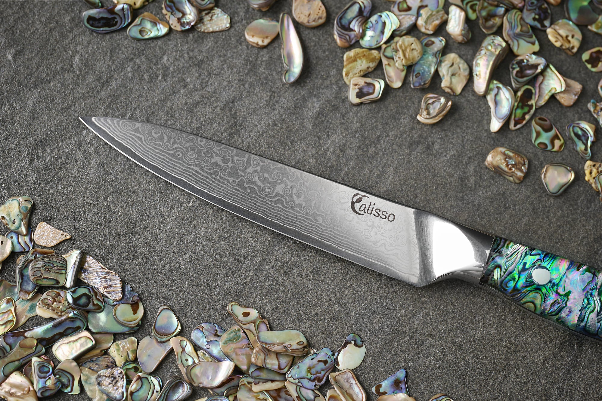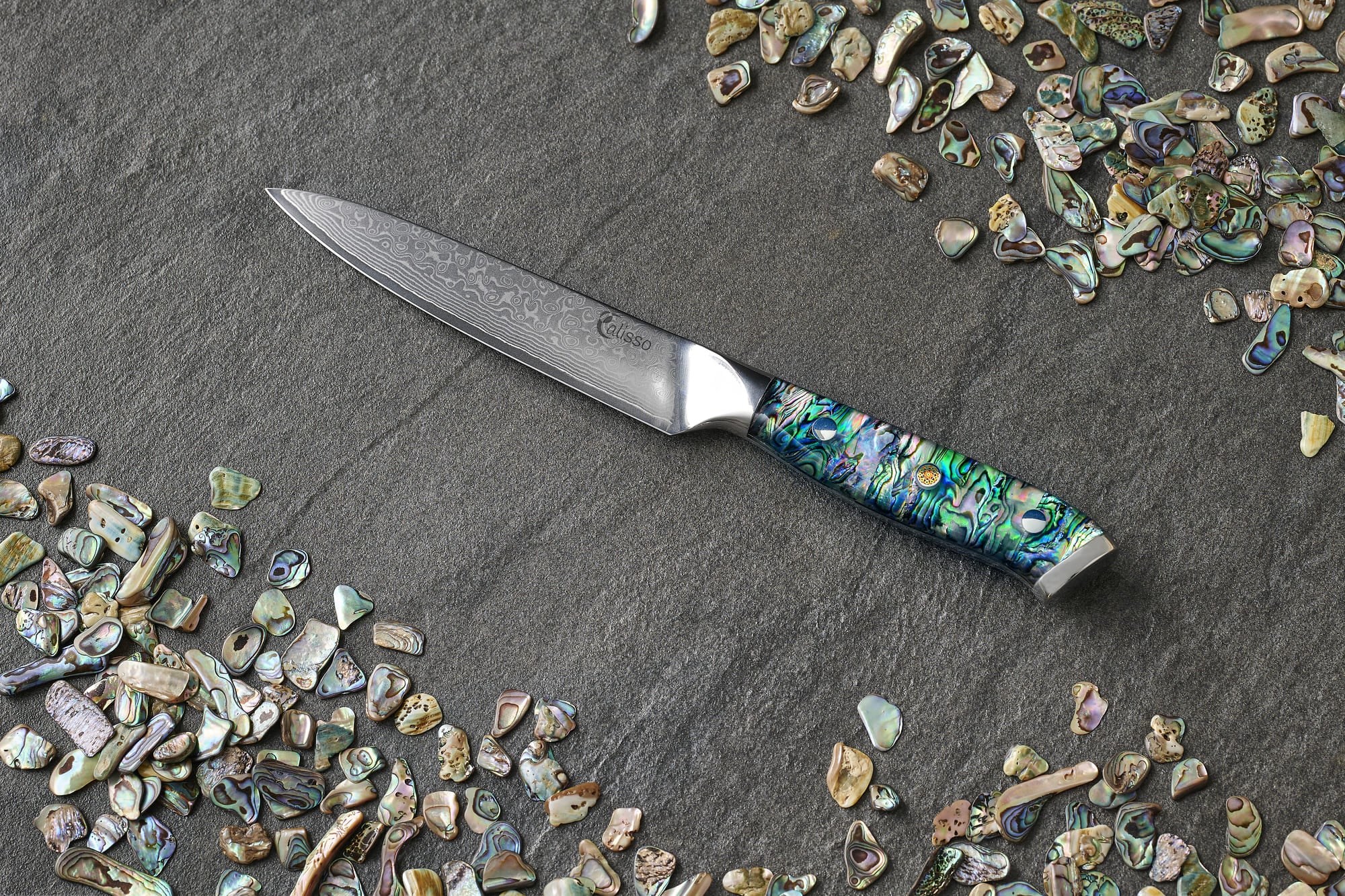 المحار العمره عقود في المقبض يضمن أن لا سكين يشبه الآخر. كل سكين هو قطعة فريدة.