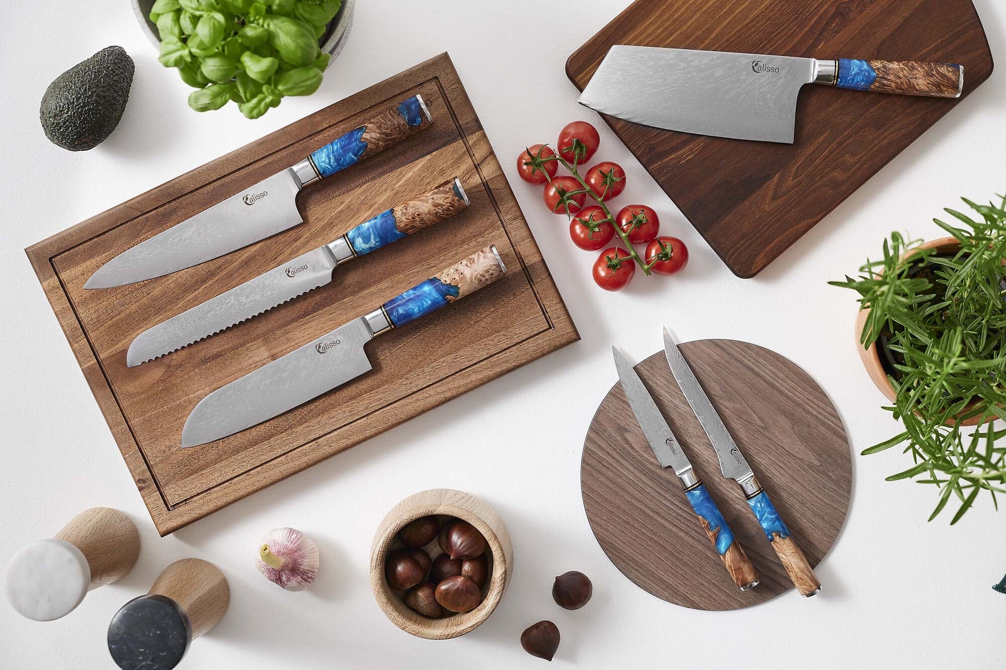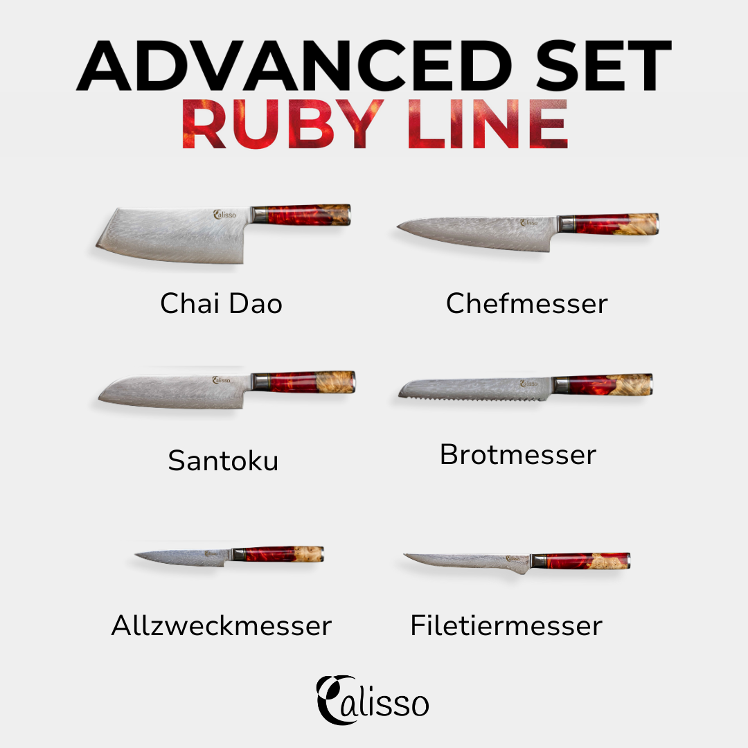 يحتوي على جميع سكاكين مجموعة Advanced إما الخط Aquamarine أو Ruby