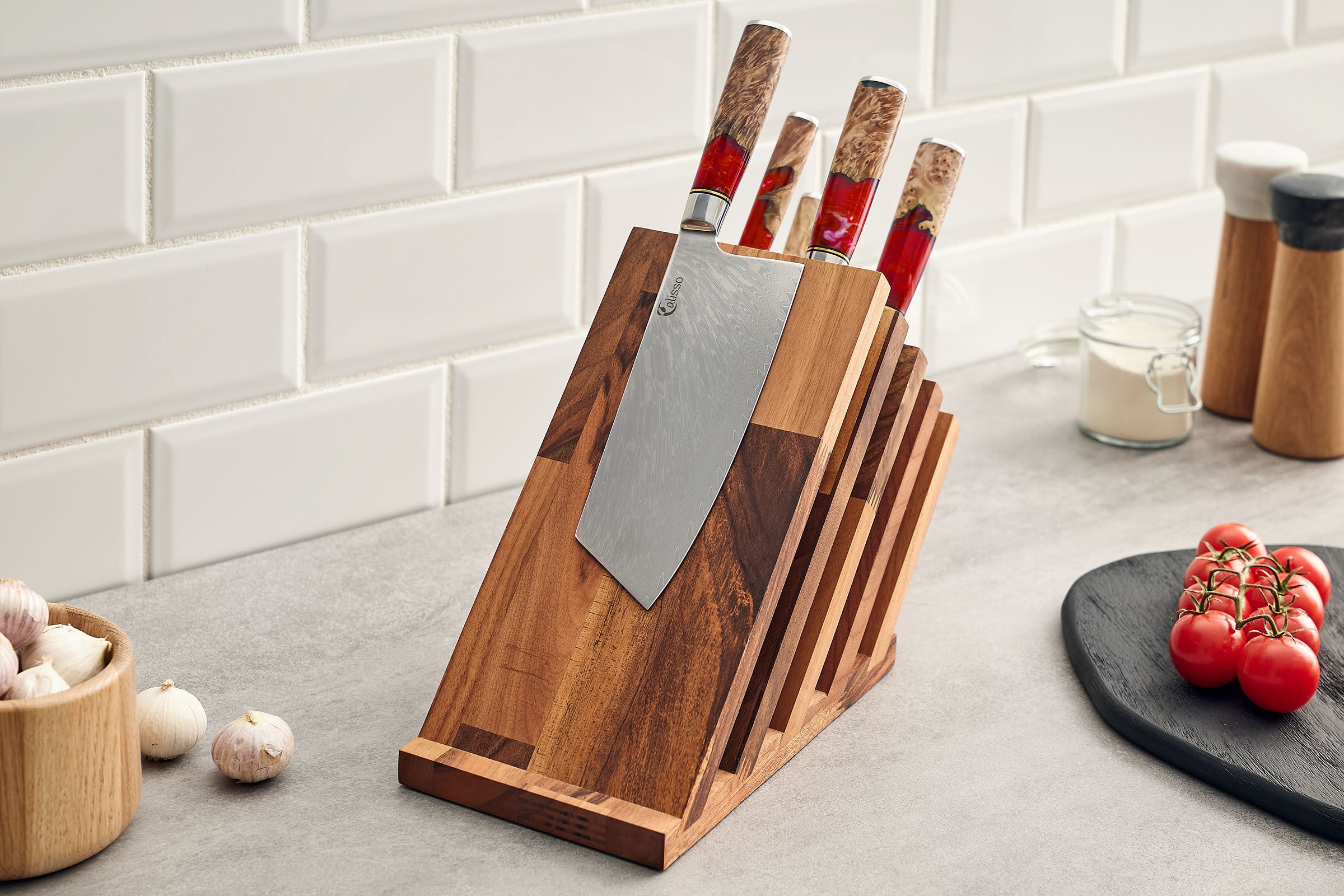 بلوك السكاكين المغناطيسي من خشب الجوز يتيح وصولاً سهلاً أثناء الطهي إلى أكثر السكاكين استخدامًا ويحفظ سكاكينك المفضلة بإحكام.
