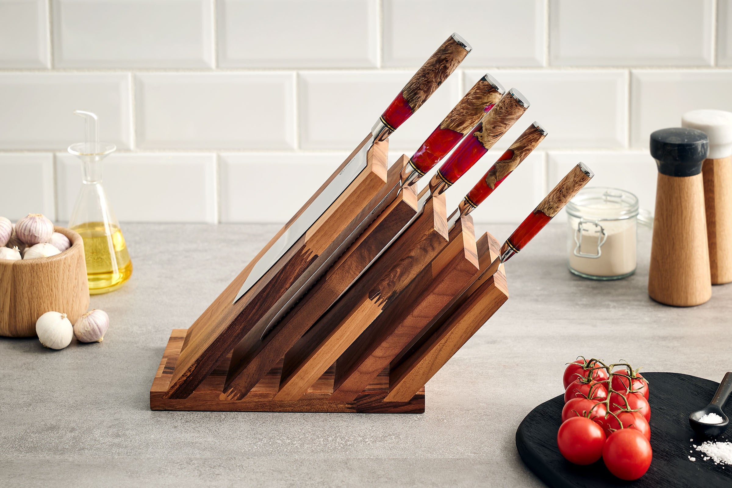 التصميم المعماري واللون الداكن القوي لخشب الجوز، المشهور بمظهره الفاخر، سيزين رخامة مطبخك. بلوك السكاكين المغناطيسي بدون سكاكين قطعة جذابة مطلقة لكل مطبخ.