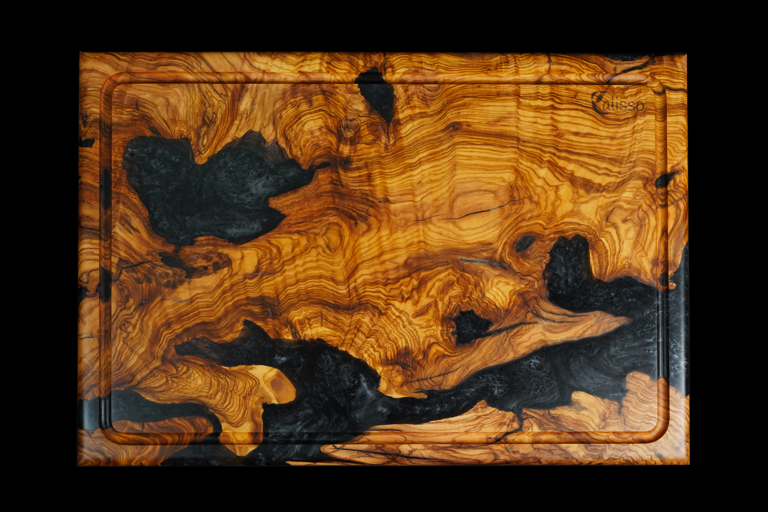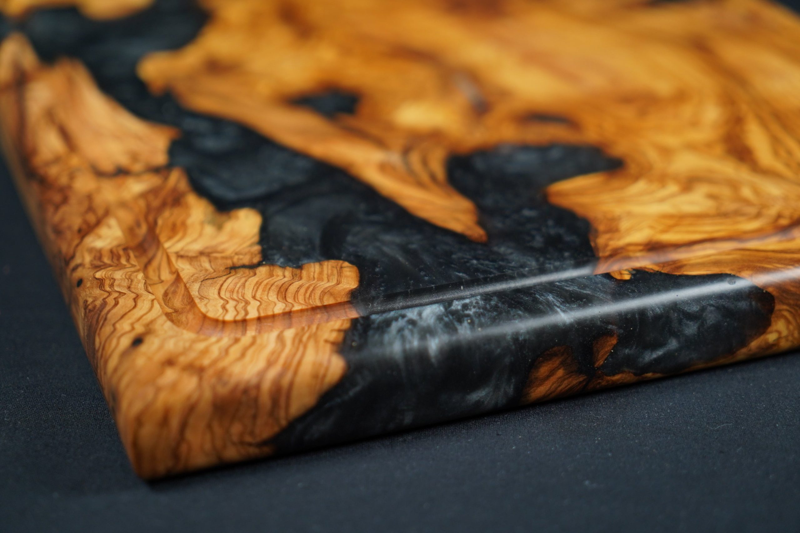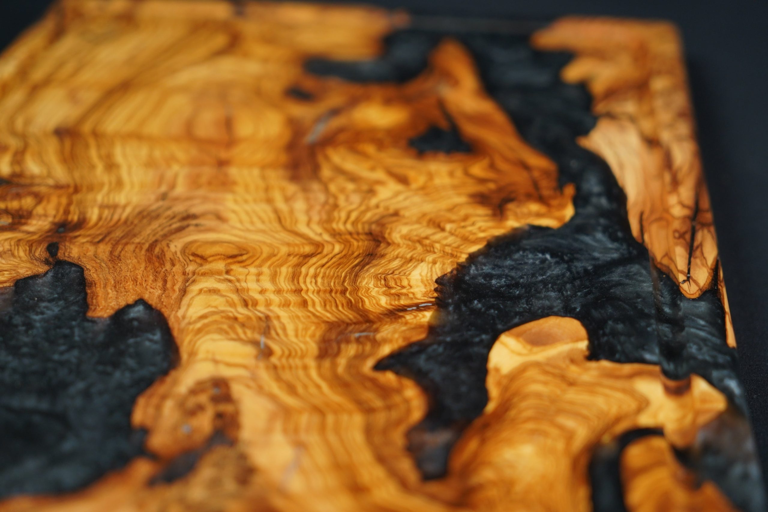 تُغمر الخصائص الفردية لخشب الزيتون بالراتينج المتباين، فتُخلّد في لوح التقديم. كل لوح يروي قصته الخاصة، ويكون قطعة فريدة حقًا.