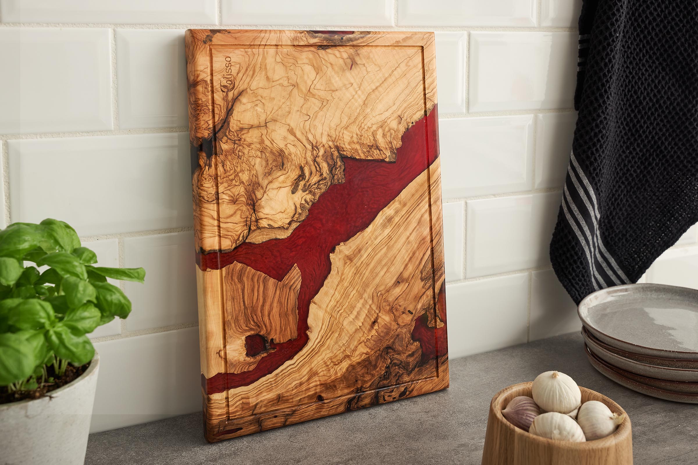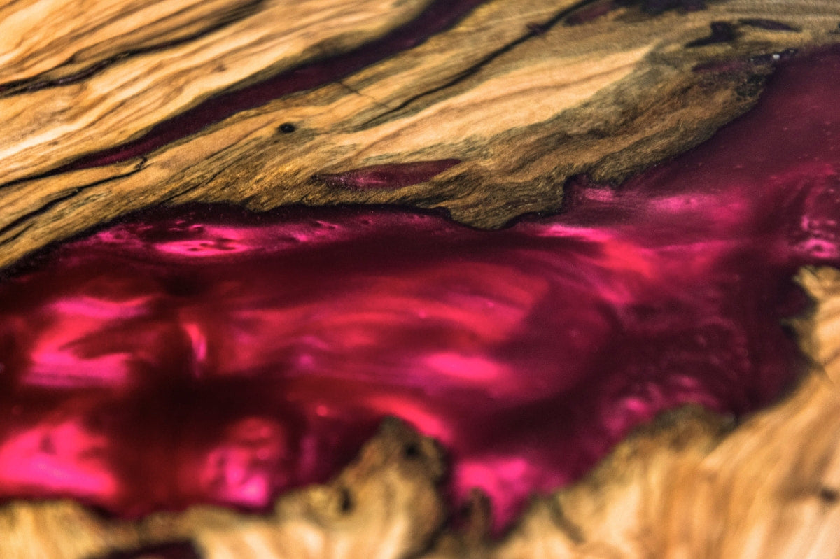 تُغمر الخصائص الفردية لخشب الزيتون بالصمغ المتباين اللون، فيُحفظ ذلك في صينية التقديم إلى الأبد. كل صينية تحكي قصتها الخاصة وتُعدّ قطعة فريدة حقيقية.