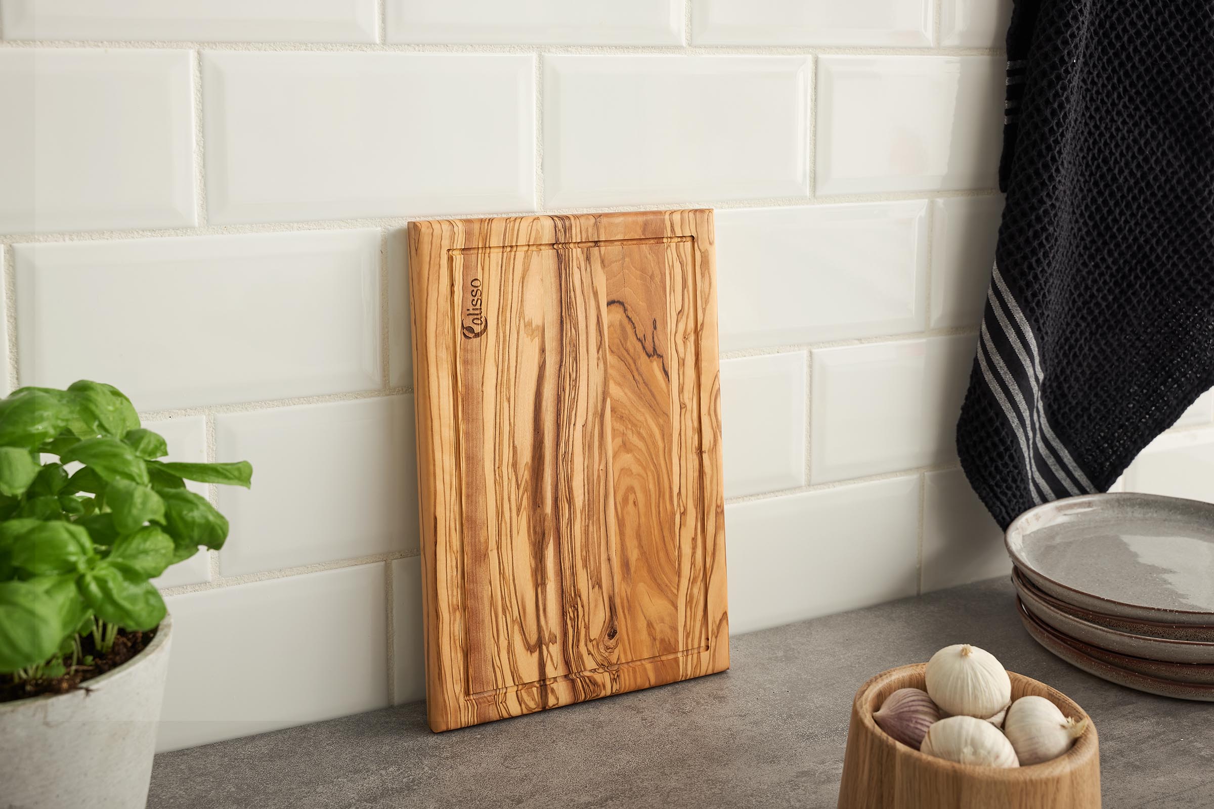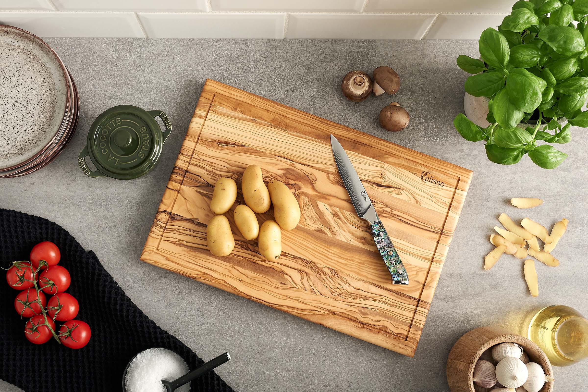 لوح التقطيع المصنوع يدويًا من خشب الزيتون المتعرج هو قطعة جذابة حقًا في مطبخك. يستقر اللوح بأمان على أي سطح ويسهل تنظيفه للغاية. المحتوى الطبيعي من الزيت في خشب الزيتون يوفر حماية من البكتيريا. القنوات السائلة الواسعة على جميع الجوانب تُمسك السوائل وسهلة الصيانة.