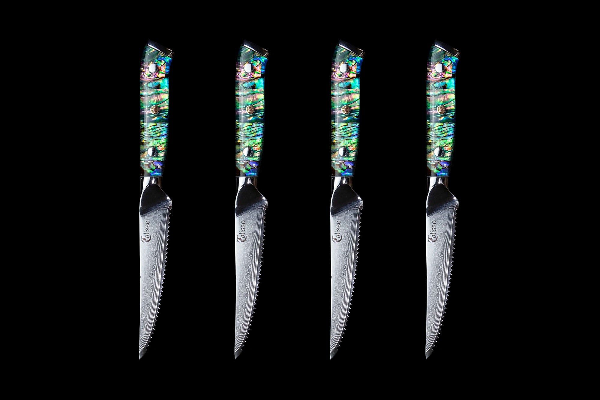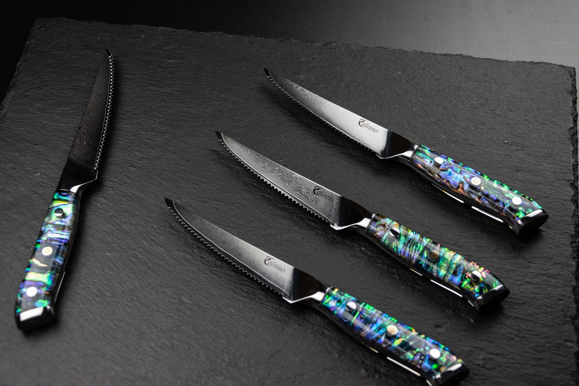 المحار العمره عقود في المقبض يضمن أن لا سكين تطابق الأخرى؛ كل سكين قطعة فريدة.