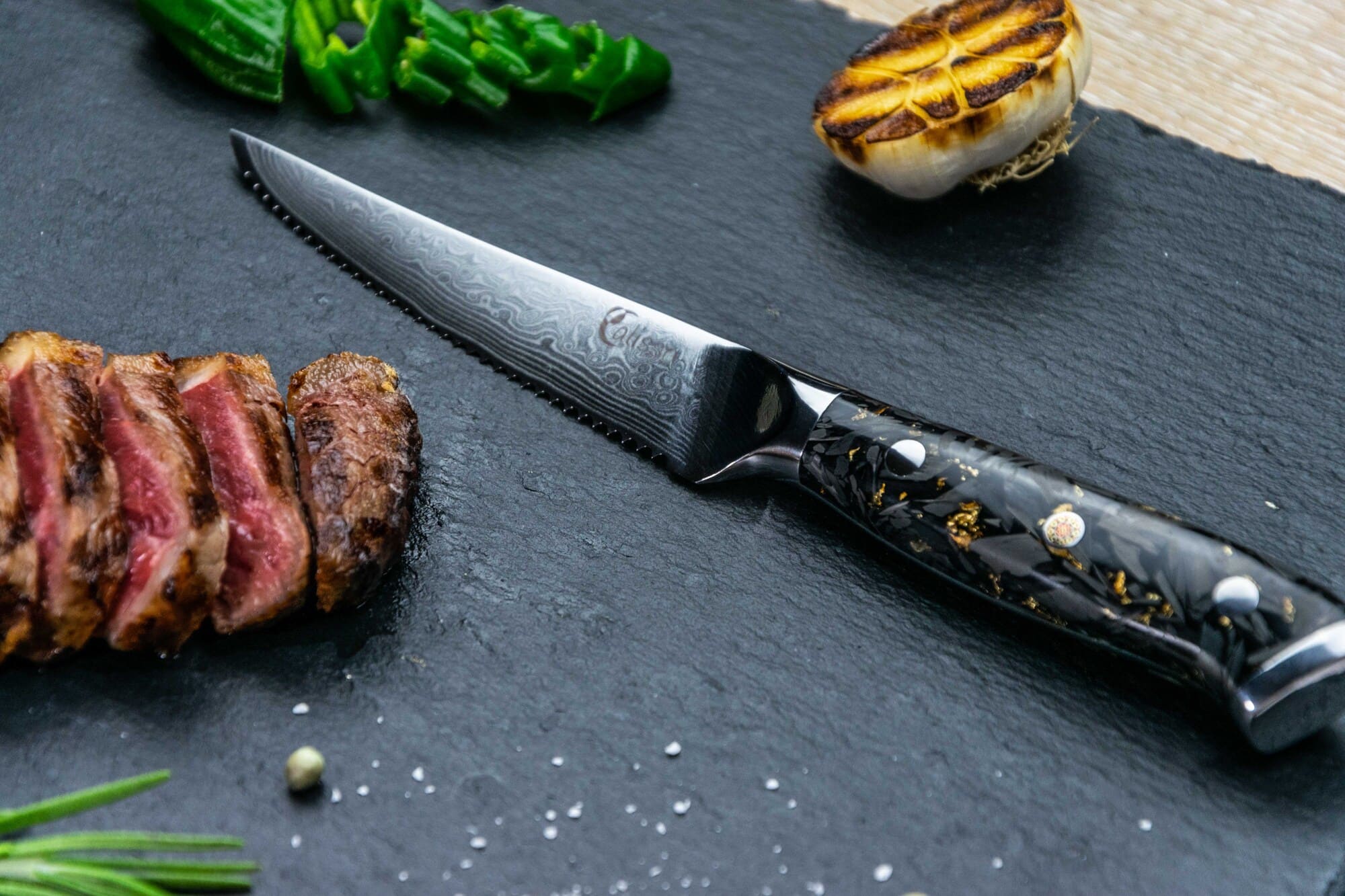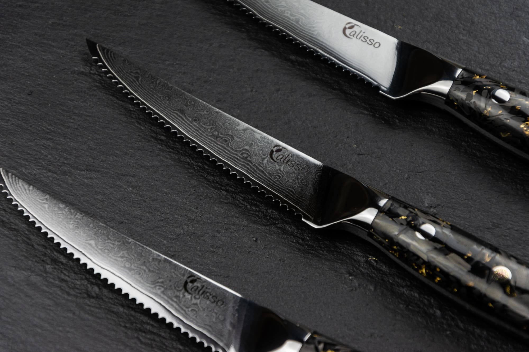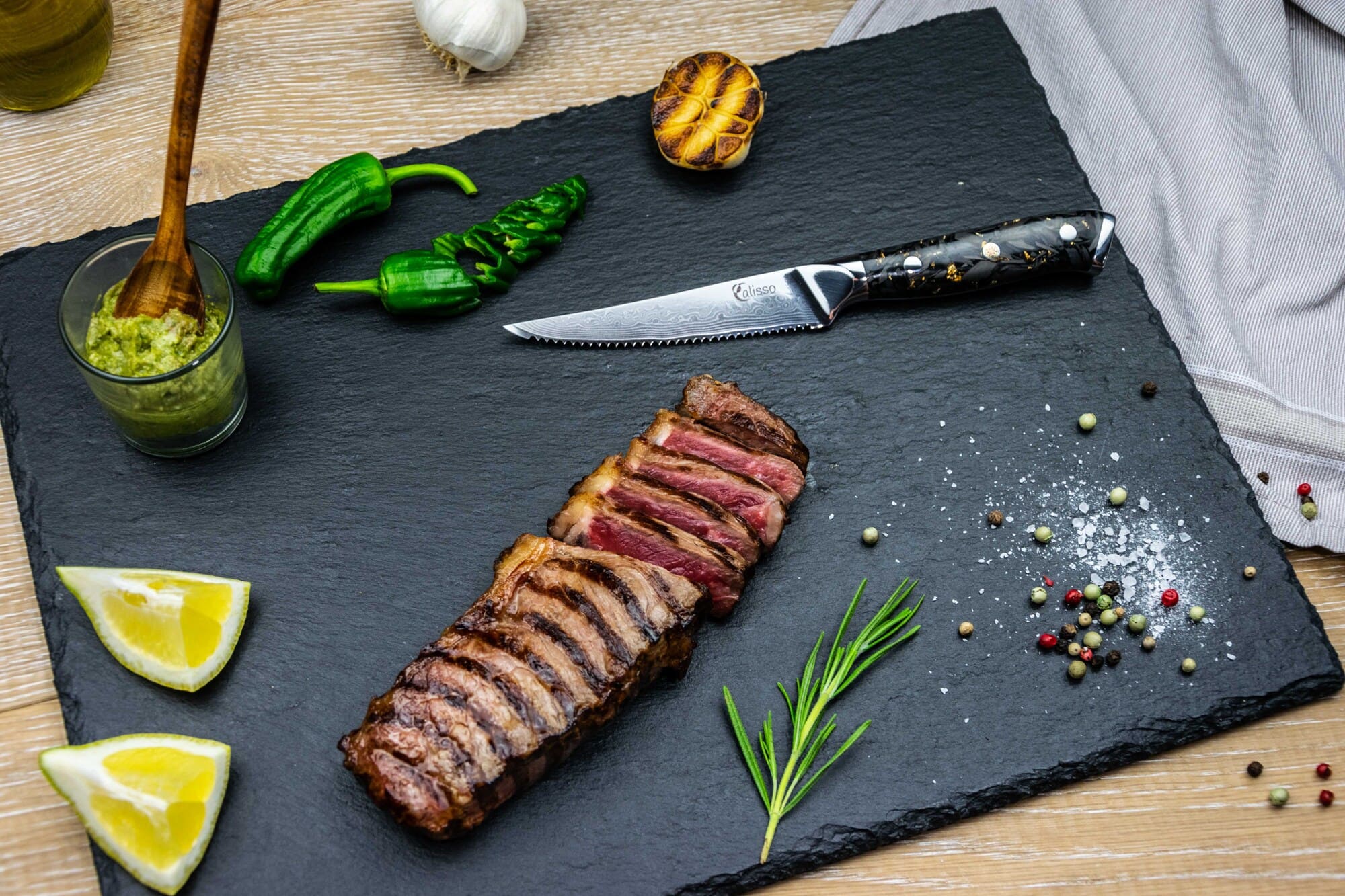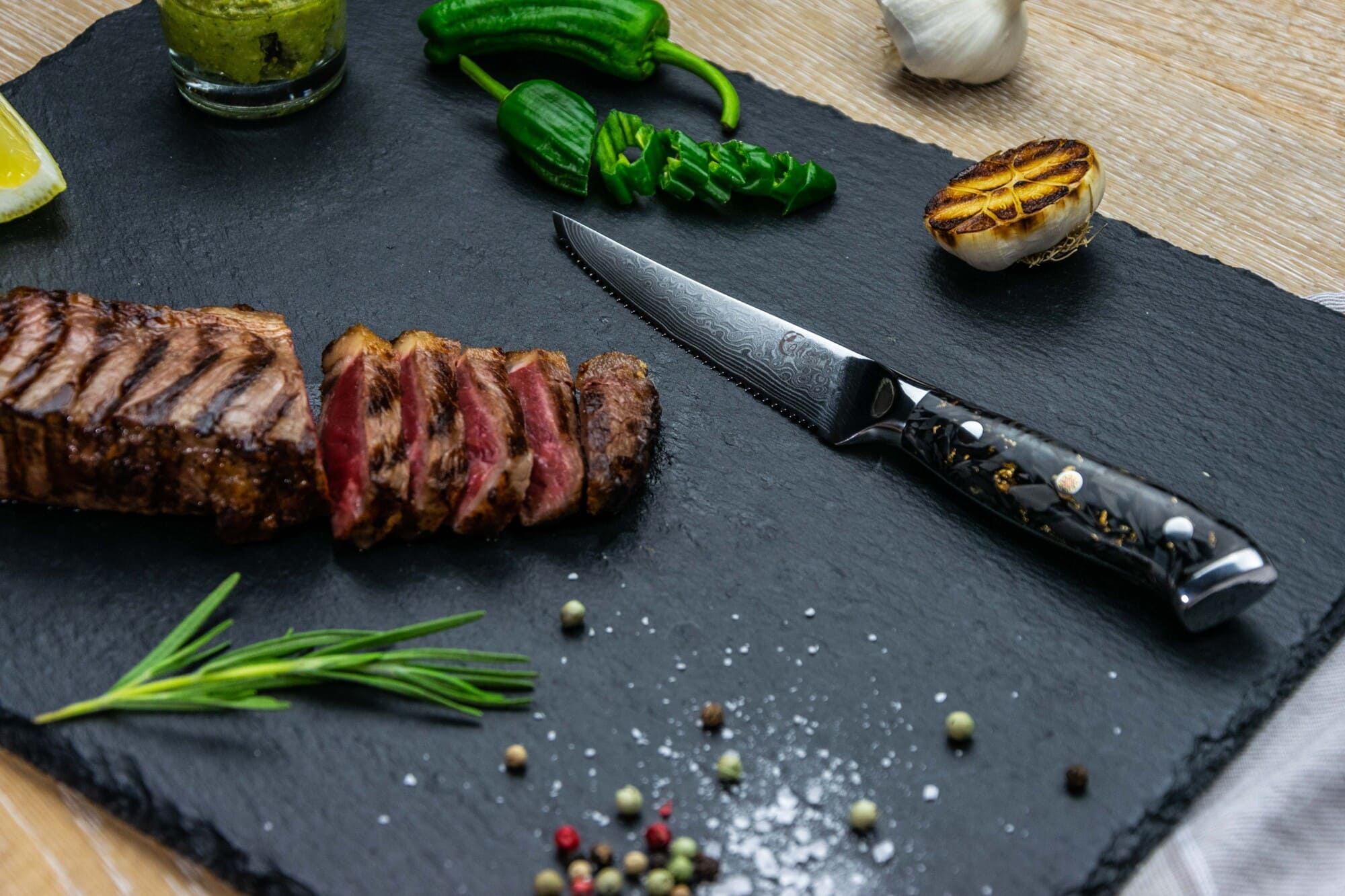 سكين شريحة اللحم يتميز بحدّة ممتازة، وهو أمر بالغ الأهمية خاصة عند تقطيع شريحة لحم جيدة. الأسطح الصلبة مثل السيراميك لا تشكل تحديًا لسكين شريحة اللحم، فبفضل حافته المسننة تبقى الشفرة حادة لفترة طويلة جدًا. وهكذا سيصبح حفل شريحة اللحم القادم بعد القادم حدثًا رائعًا.